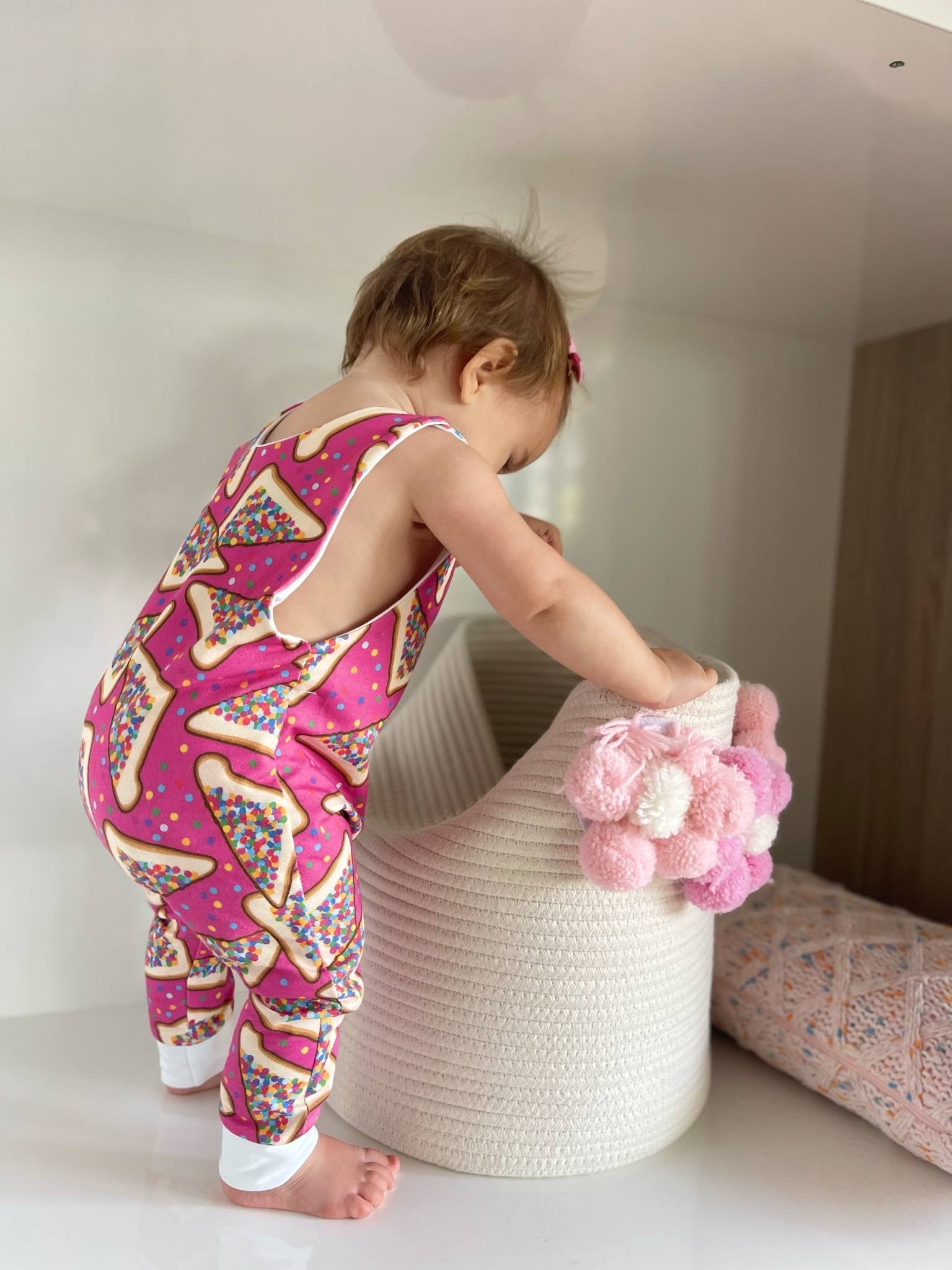 The Fairy Bread Romper features a thoughtfully engineered cotton-lycra blend designed specifically for winter layering. The extended leg length provides versatile coverage that works seamlessly under additional pieces, while the fabric composition offers the breathability of cotton with the stretch and durability of lycra. This construction makes it an ideal base layer or standalone piece for cooler months, delivering both comfort and practical functionality for layered styling.